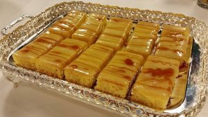 6-اخرجيها من الفرن وزينيها بصوص الكراميل وخليط الكريم كراميل المتروك جانباثم قطعيها و قدميها.