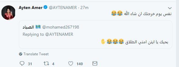 تفاجأ أحد معجبي الفنانة آيتن عامر بردها عليه عبر حسابها الخاص على موقع التواصل الاجتماعي تويتر.