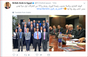 وأضافت الصفحة عبر موقع التدوينات القصيرة “تويتر”: “الوفد التجارى برئاسة مندوب رئيسة الوزراء، مؤكدا أن وصل 70 ٪ من الشركات أول مرة تيجى مصر.. أحلى وفد ولا ايه؟”