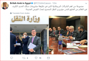 قامت الصفحة الرسمية للسفير البريطانى فى مصر جون كاسن، بنشر صور لمجموعة من أهم الشركات البريطانية التى تعمل فى مشروعات سكك الحديد الكبرى فى العالم من الخليج للندن مع وزير النقل المصرى لبحث الفرص الجديدة.