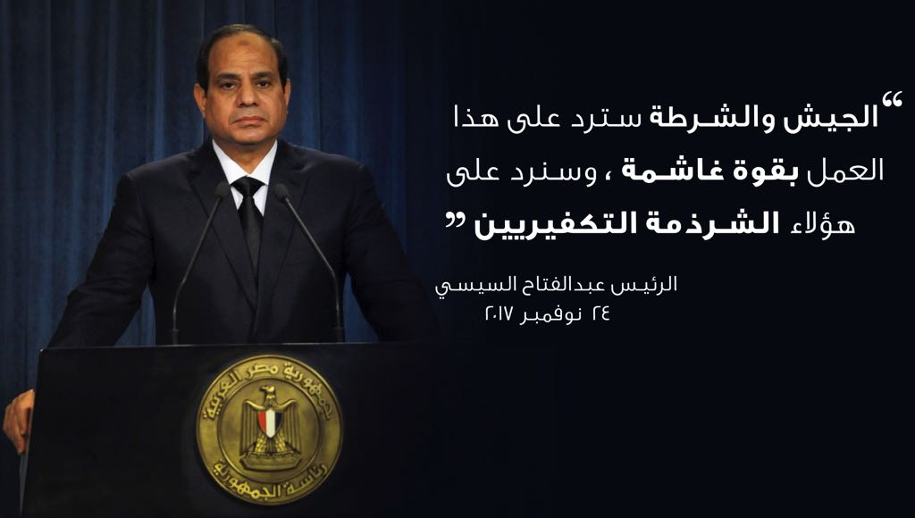 بعد حادث مسجد الروضه بالعريش الذي وقع ضحاياه أكثر من 250 شهداً و 150 مصاياً ظهر الرئيس عبدالفتاح السيسي بعد ساعات من حادث العريش الإرهابى، وجه الرئيس عبد الفتاح السيسي كلمة للمصريين ، قال فيها: “شعب مصر العظيم، أيها الشعب الأبى الكريم اسمحوا لى ان أتوجه لكم جميعاً بالعزاء.. للشعب المصرى كافة وأسر الضحايا فى سيناء، وأتمنى الشفاء للمصابين ، تم إعلان حالة الحداد فى مصر على هذا الحادث الأليم الغادر الخسيس الجبان الذى كان يهدف إلى تحطيم معنوياتنا، وتدمير صلابتنا والتشكيك فى قدراتنا