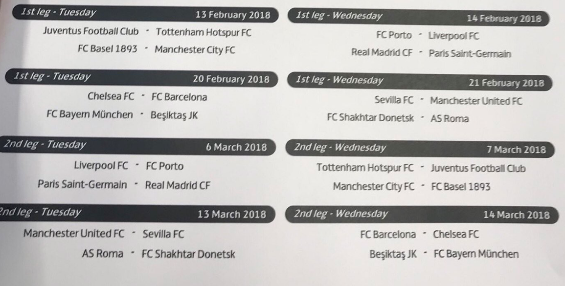 ويبدأ هذا الدور بمباراتي يوفنتوس وتوتنام هوتسبرز وبازل ضد مانشستر سيتي يوم الثلاثاء 13 فبراير المقبل، على أن يكون الإياب يوم الأربعاء 7 مارس.