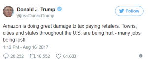 ترامب انتقد فى تغريدة على موقع الرسائل القصيرة “تويتر”، عملاق التجزئة الإلكترونية أمازون دوت كوم بسبب الضرائب والوظائف، واتهمها “دون دليل” بالإضرار بالمدن والولايات في شتى أنحاء البلاد والتسبب في خسارة وظائف؛ وتابع ان أسهم أمازون سوف تنهار مثل” كيس من ورق”.