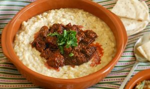8-نضع فى طبق التقديم كمية وفيرة من البهجة وفى المنتصف اللحمة و تزين بالبقدونس.