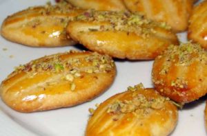 7-اخرجيها من الفرن و اسقيها بالشربات وزينيها بجوز الهند أو الفستق المفروم وقدميها.