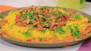6- ضعى الخبز ثم الأرز ثم الدجاج ثم الثومية، وقدمى الباقى من الثومية بجانب الفتة.