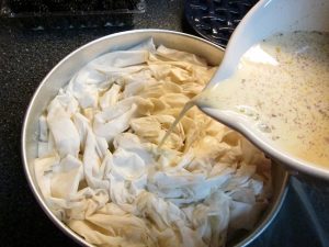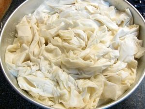3-نحضر الصينية ونحضر ورقة من الجلاش ونكرمشها ونضعها فى الصينية ونكرر الأمر مع باقى ورق الجلاش ونرتبهم جنبًا إلى جنب فى الصينية بالشكل الموضح بالصورة.