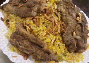 11-اغرفي الأرز في صحن التقديم وضعي اللحم عليه و قدميه.