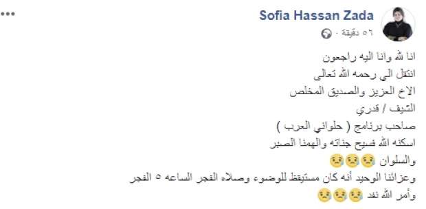 وكتبت صوفيا زيادة علي حسابها الرسمي علي فيس بوك عن وفاة الشيف قدري في الساعات الأولى من صباح اليوم الإثنين داخل منزله بشكل مفاجئ أنه لفظ أنفاسه الأخيرة، في تمام الساعة الخامسة صباحًا، فور استيقاظه لصلاة الفجر.